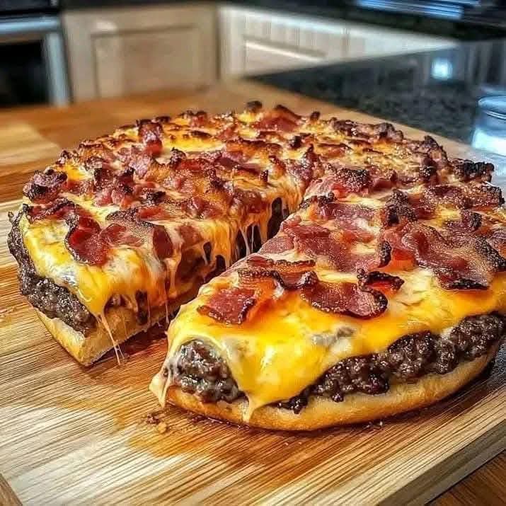 the hearty, savory goodness of a classic burger and the indulgent flavors of a pizza. It’s perfect for a party, family dinner, or any occasion where you want to impress. Imagine a pizza crust topped with a juicy beef patty, layers of melted cheese, crispy bacon, and all the classic burger fixings, making it a deliciously satisfying meal that everyone will love. With every bite, you’ll experience the best of a burger and pizza in one!