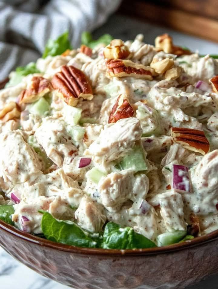 This chicken salad is creamy, nutty, and slightly sweet with a satisfying crunch from the pecans and celery. The grapes or cranberries offer a refreshing contrast to the rich dressing, while Dijon and vinegar add a subtle tang. It’s a wholesome, hearty salad that feels indulgent but is full of real, simple ingredients — the kind of timeless recipe that earns its “famous” label at family gatherings and luncheons alike.
