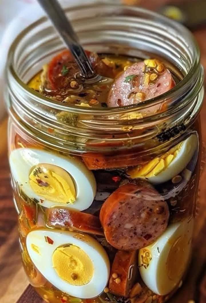 This dish brings together the tangy flavor of pickled eggs, savory sausage, and the sweet aroma of marinated onions for a hearty and delicious treat. It’s perfect as an appetizer, snack, or part of a picnic spread.