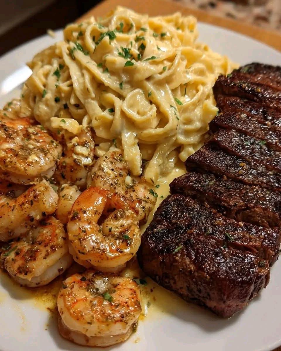 This dish is creamy, bold, and decadent. The Alfredo sauce is velvety and rich, coating every strand of pasta, while the Cajun spices bring smoky heat. Juicy shrimp and tender steak add texture and flavor, making this a filling and luxurious meal that feels like something straight out of a steakhouse.