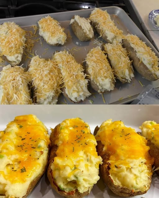 Reduce oven temperature to 375°F (190°C). Place stuffed potatoes on a baking sheet and bake for another 15–20 minutes, until heated through and cheese is melted and bubbly.